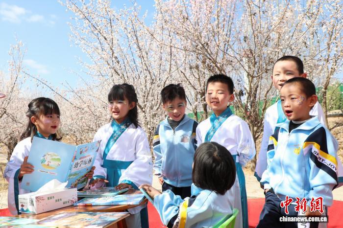 3月31日,青海化隆,小同伙正在杏花树停吟诗。化隆县素有“9直黄河化隆秀”的佳誉,黄河道经县域168千米,气象温馨干润,每一年清朗节先后,成片杏花竞相开放,城家间1片生气盎然。中新社记者 马铭行 摄
